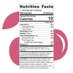 Ingredients: Carbonated water, erythritol, citric acid, sodium citrate, natural flavors, malic acid, blueberry juice powder, natural caffeine, elderberry juice powder, sucralose, potassium sorbate (preservatives), sodium benzoate (to protect color), ascorbic acid (to protect color), xanthan gum.